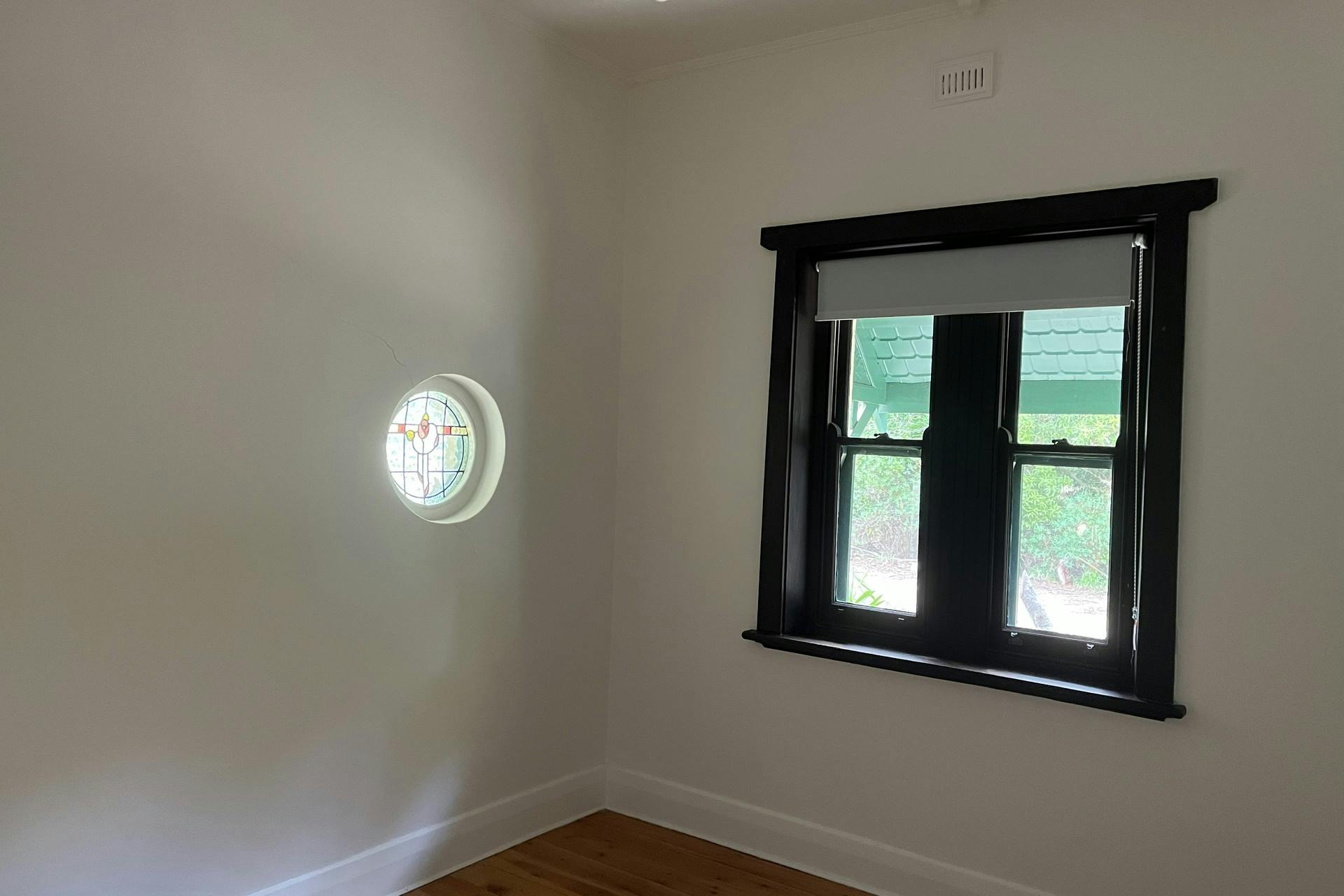 Slow combustion heater and reverse cycle servicing lounge room.