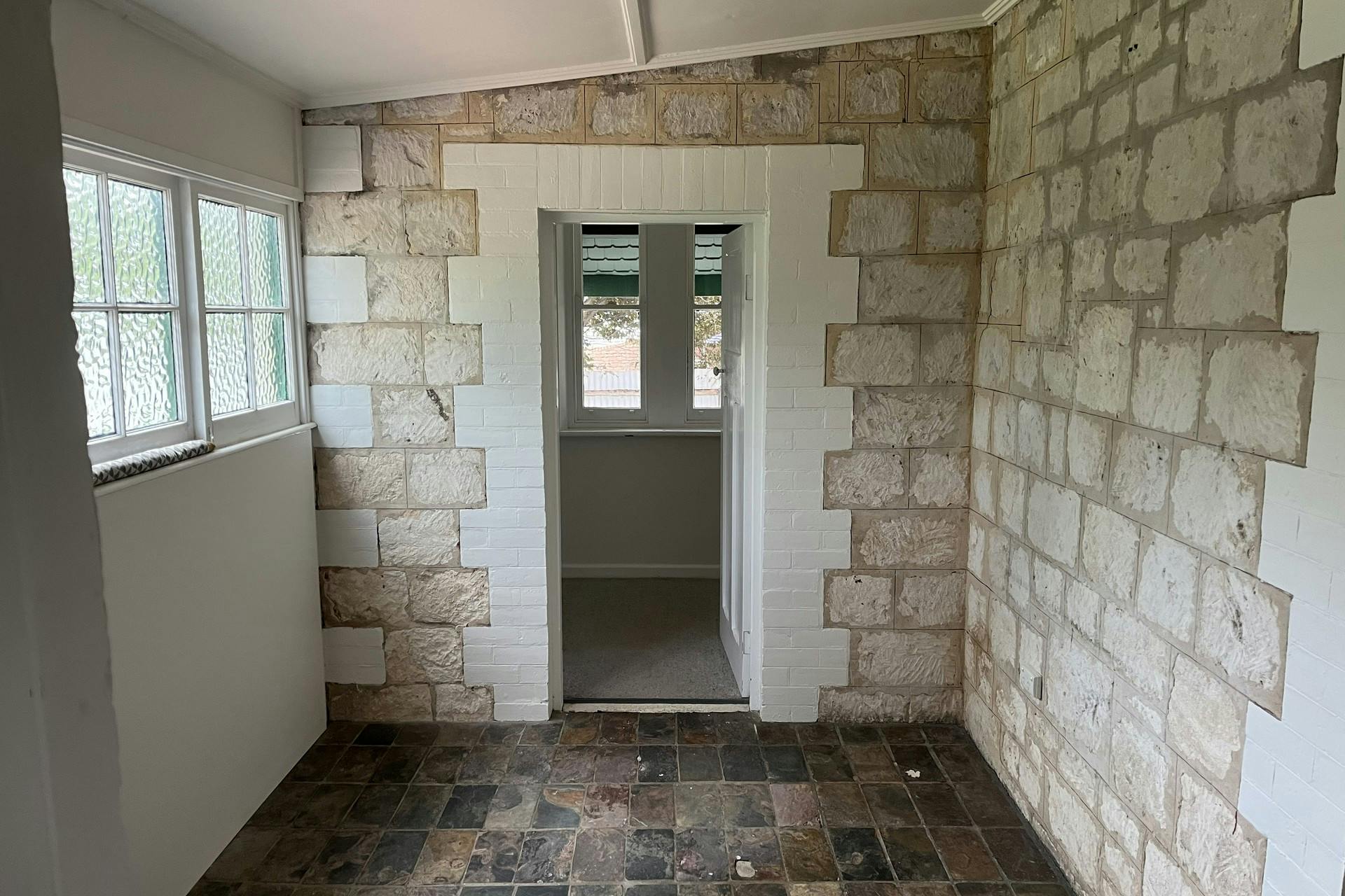 Two bedroom stone home with small office.All in one bathroom with shower, bath, vanity, toilet and laundry.